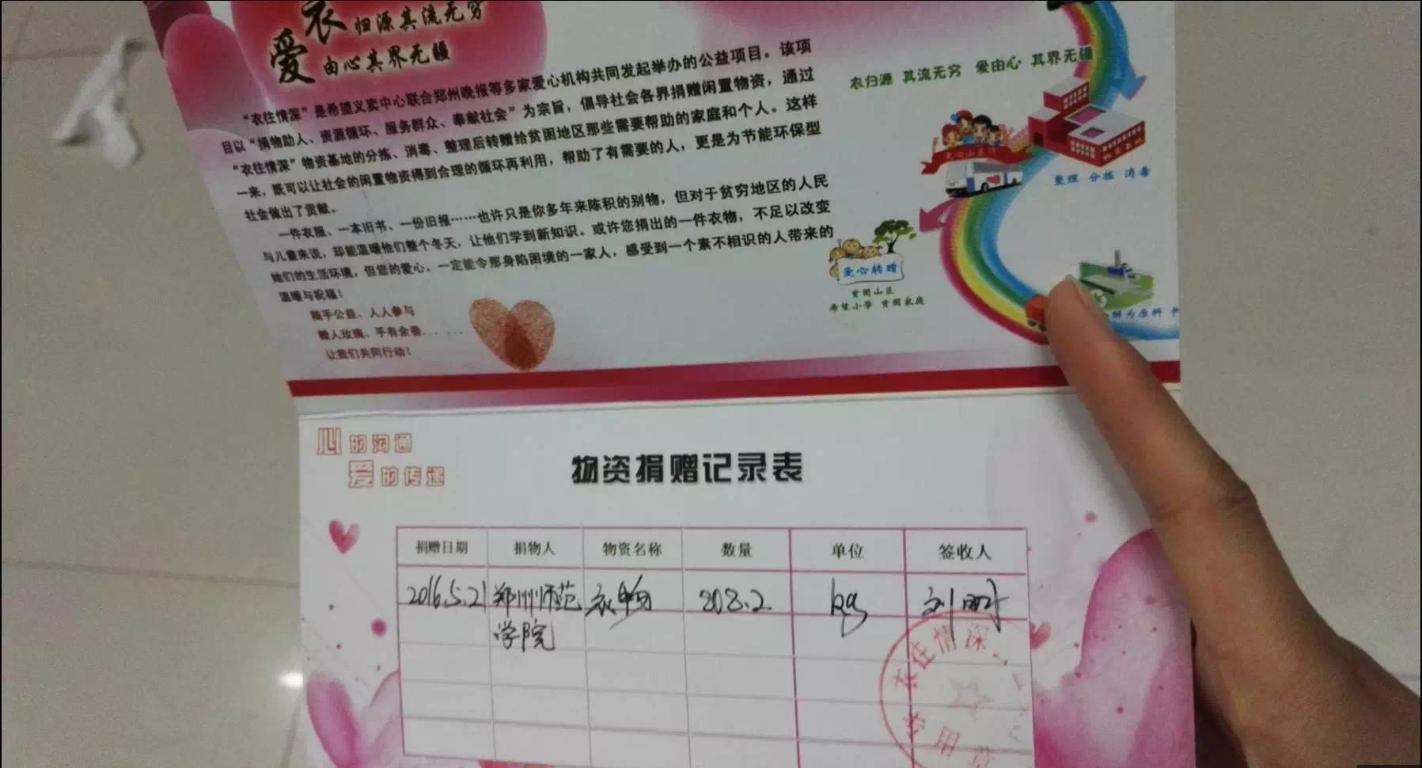 截止2016年5月22日,历史文化学院的志愿者们已经连续工作了半个多月,活动期间,同学们热情很高,积极捐衣,志愿者认真细致,轮流每天整理熊猫里的衣物并定期擦洗熊猫的身体,到活动截止已收集多达50多袋衣物。2016年5月22日,志愿者联系好“衣往情深”公益组织过来接收衣物,志愿者们提前来到储衣间清点整理衣物,接收衣物负责人对衣物称重并给予志愿者一张爱心荣誉卡,本次捐衣重达808.2kg,这一成果离不开奉献爱心的每一位同学,还有志愿者的默默付出,
