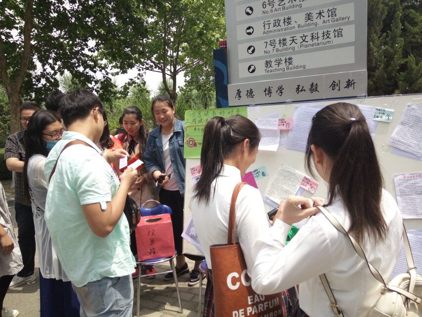 在12点之前,志愿者们就把展板、海报、桌子、投票箱等都搬到了活动现场,佩戴好绶带,等待着同学们前来参观读书成果。有的同学写的整本书的读后感;有的同学摘抄的好文、写的心得体会;还有的同学甚至把自己的读书成果制作成了PPT,一张一张打印出来,在展板上确实也夺人眼球。随着运动会闭幕式结束,一大波同学从操场涌出,看到我们的展板,都纷纷过来询问,我们的志愿者也积极向同学们介绍我们四月读书月的活动。同学们翻看展板上的读书成果,并写下了自己喜爱的读书成果的序号,投入投票箱,参与投票。现场投票就在同学们积极参与,热情讨论的氛围中落下了帷幕。5月16日至5月18日,即下周一至周三,读书成果将会在信科院团学之家官方微信上进行展示,欢迎各位同学查查看读书成果并为喜欢的读书成果投票,