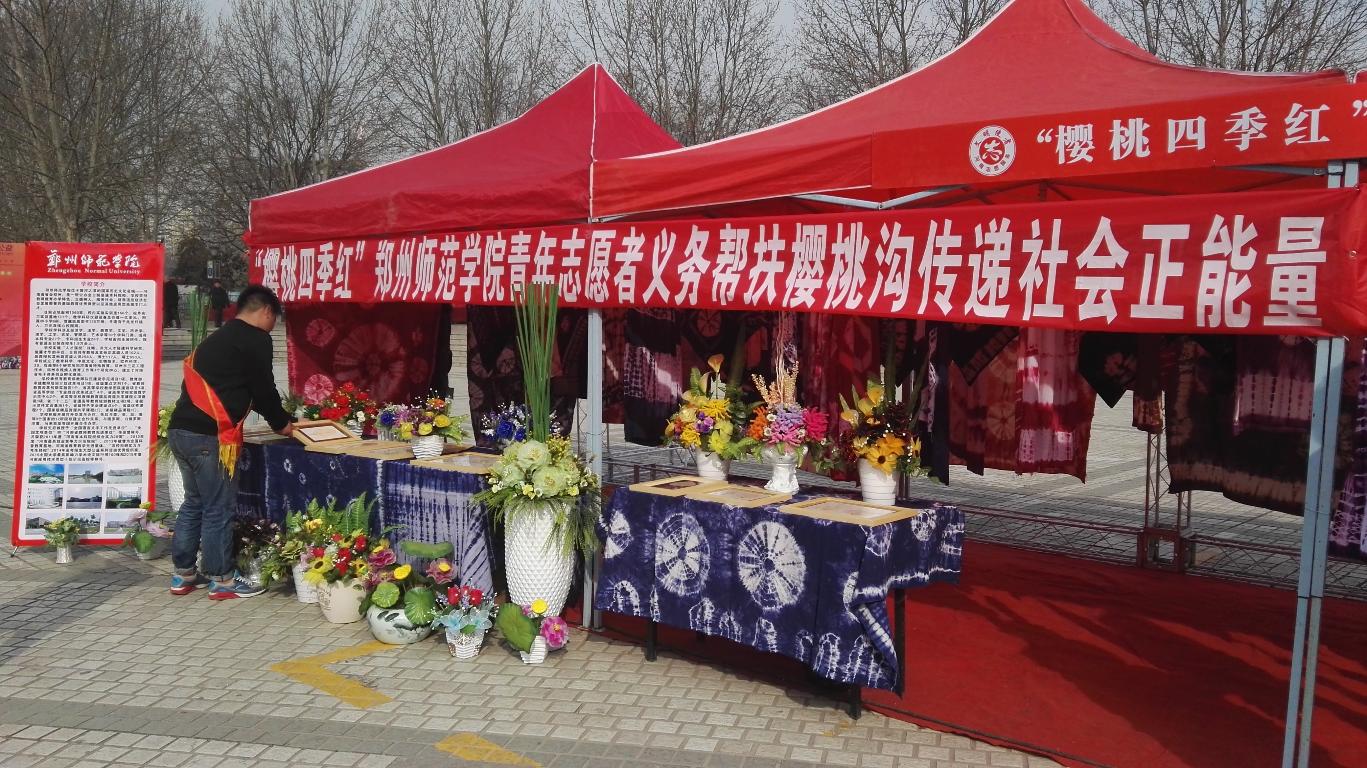 嘹亮的歌声中,优秀志愿服务项目展示也拉开了帷幕。郑州师范学院“樱桃四季红”青年志愿者服务项目负责人王雪老师带领美术学院的青年志愿者们参加了此次活动,并现场展示了大量的手工成果—扎染、手工丝网花和叶脉装饰画,引来了大量群众的围观,郑州市志愿者联合会会长武国瑞,郑州市委宣传部副部长、文明办主任裴保顺、市文明办副主任姬月莲对本项目都给予了肯定,并对此项目寄予厚望,希望我们今后能为广大的村民提供更多的种类的技能培训从而提高生活水平,为郑州市塑造有标杆性的正能量。