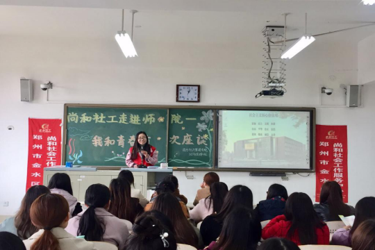 2017年3月24日,为响应第十一个国际社工日宣传周活动,郑州市金水区尚和社会工作服务中心到我校政治与公共管理学院举办了主题为“尚和社工走进师院——我和青春有次座谈”的宣讲活动。本次宣讲嘉宾是来自“尚和社工”的社工张亮、王金凤,我院社会学系全体师生参加了本次活动。