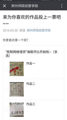 以学院官方微信、微博平台为载体,发动全院学生投票,寻找设计理念新颖,内容贴合主题、积极向上,结构完整,具有艺术表现力和感染力,贴近大学生校园生活实际的宣传海报。