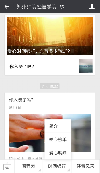 5月15日“爱心时间银行”的微信版正式上线。通过大学生常用的微信平台,志愿者可以查询自己的“爱心账户明细”以及自己在学院的“爱心排名”。此外,志愿者可以通过经管学院官方微信、微博平台@“爱心时间银行”工作小组成员,支取自己的爱心储蓄。每两星期都会通过经管学院官方微信、微博公众平台公布这两周内“爱心时间银行”的账户收支情况。