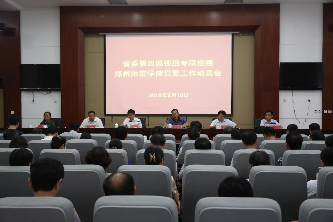 根据省委统一部署,省委第四巡视组进驻我校进行为期一个半月的专项巡视。8月18日上午,省委第四巡视组专项巡视郑州师范学院工作动员会在图书馆十楼报告厅举行。省委巡视工作领导小组成员、办公室主任张战伟同志,省委第四巡视组组长孙丰年同志,副组长翟迎波同志、黄明海同志,以及巡视组全体成员,郑州师范学院领导班子成员出席会议。校内各单位党政主要负责人(含研究所所长)及组织部、纪委、人事处等相关人员参加会议。校党委书记于向英代表学校党委及领导班子作表态讲话。校长赵健主持会议。