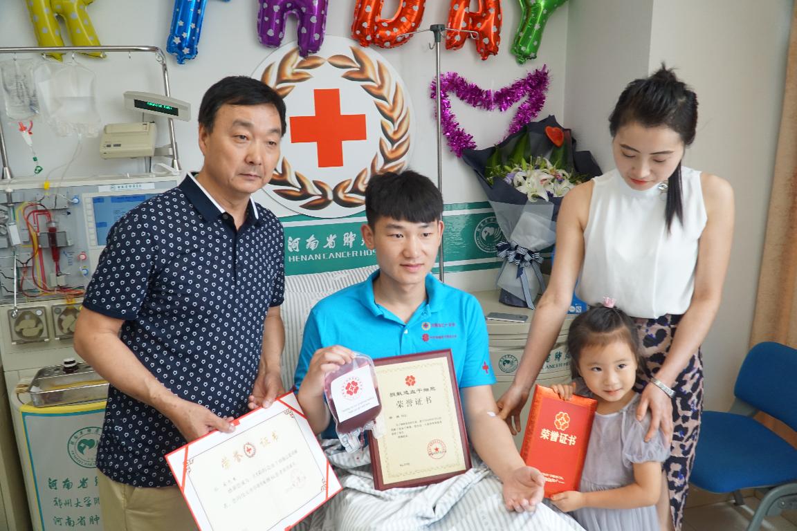 孙宾是全国第5791位、河南第560位、郑州第214位造血干细胞志愿捐献者,同时还是95后捐献第一人。中国干细胞捐献者资料库管理中心、河南省红十字会、郑州市红十字会的负责人也来到采集中心,分别向孙宾同学献花并颁发荣誉证书。