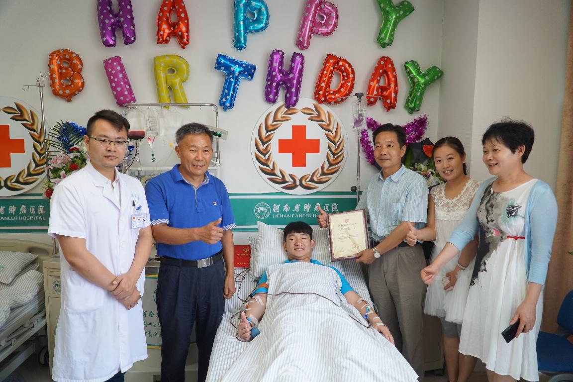 孙宾的帅气、阳光、纯粹、真挚的爱心也感动了许多人,多位曾经的捐献者来到采集中心为孙宾加油鼓气,知道今天是他的生日,还为他带来了精心制作的手编书签等生日礼物。红会工作人员和志愿者用气球和彩带将河南省肿瘤医院造血干细胞采集中心装饰一新,并买来蛋糕为孙宾过了一个颇具纪念意义的生日。对此,孙宾表示:“能在自己最好的年纪做这么一件平凡而又不平凡的事,我很幸福。希望跟我配型的姐姐早日康复,不要放弃希望。”孙宾同学是郑州师范学院近两万名学子的优秀代表,表现出了新时期90后学子勇于担当,乐于奉献的青年精神,展现出了师院人乐观向上、奉献助人的积极态度。据悉,我校还有近十位同学已经采集入库,随时等候配型捐献。