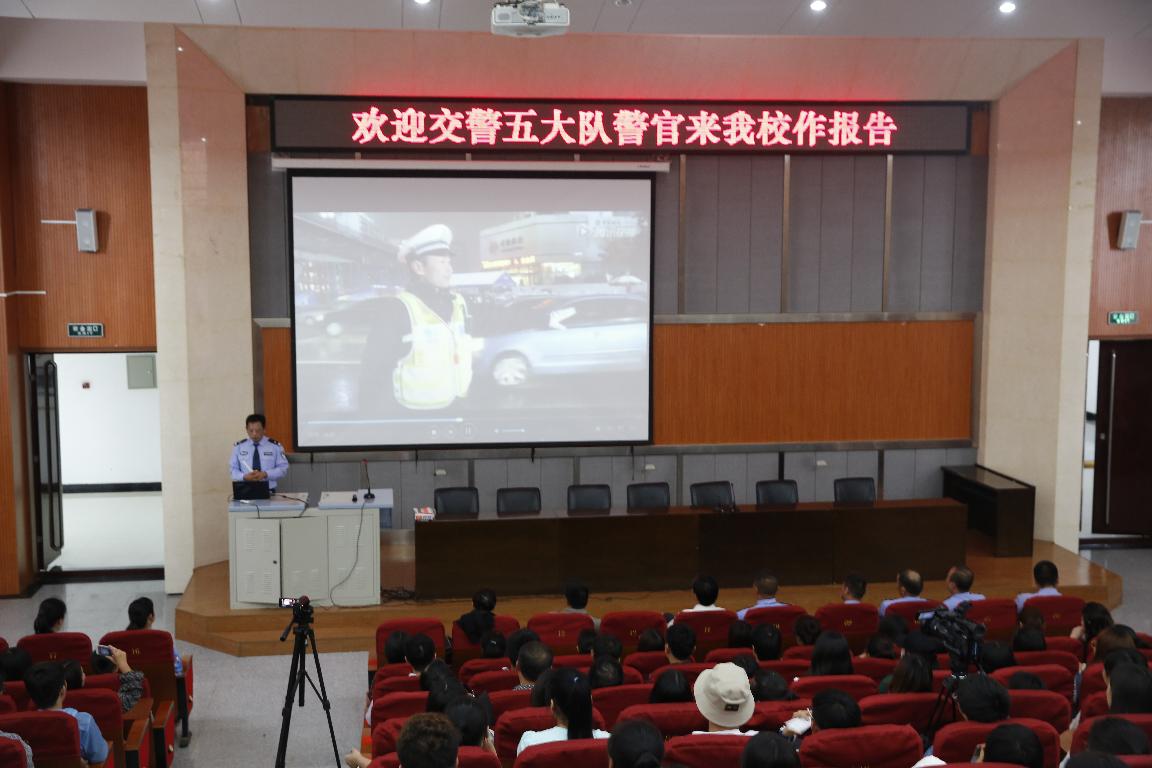 此次活动,首先由交警五大队的“科技使者”刘晓刚通过电脑课件为大家介绍了警务通、执法记录仪、流动抓拍执法车等警用装备以及微博、微信等新的服务手段,不但增加了广大师生的安全感,还使大家了解到科技强警,在方便民众,精准打击犯罪等方面的作用,进一步激发了同学们努力学习科学文化知识的热情。