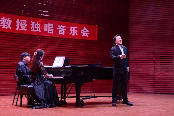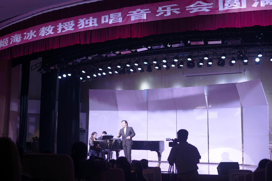 音乐会包括艺术歌曲、民歌、歌剧咏叹调和原创歌曲四部分。一首以韦瀚章《思乡》古诗为词的吟唱拉开音乐会的序幕,浑厚的嗓音,动人的情感,让听众仿佛感受到淡淡的乡愁从心间划过。大众熟知的抗日救亡歌曲《嘉陵江上》,激昂奋进,演唱者对情感准确的拿捏,浑然天成的演唱技巧,让听众为之震撼。在歌剧咏叹调篇章,姬海冰演唱了《费加罗的婚礼》《唐.帕斯夸勒》等一连串咏叹调,带领听众领略了西方古典歌剧的魅力。姬海冰教授深情的演唱,游刃有余的表演,将现场气氛一次次推向高潮,赢得在场听众们阵阵热烈的掌声。
