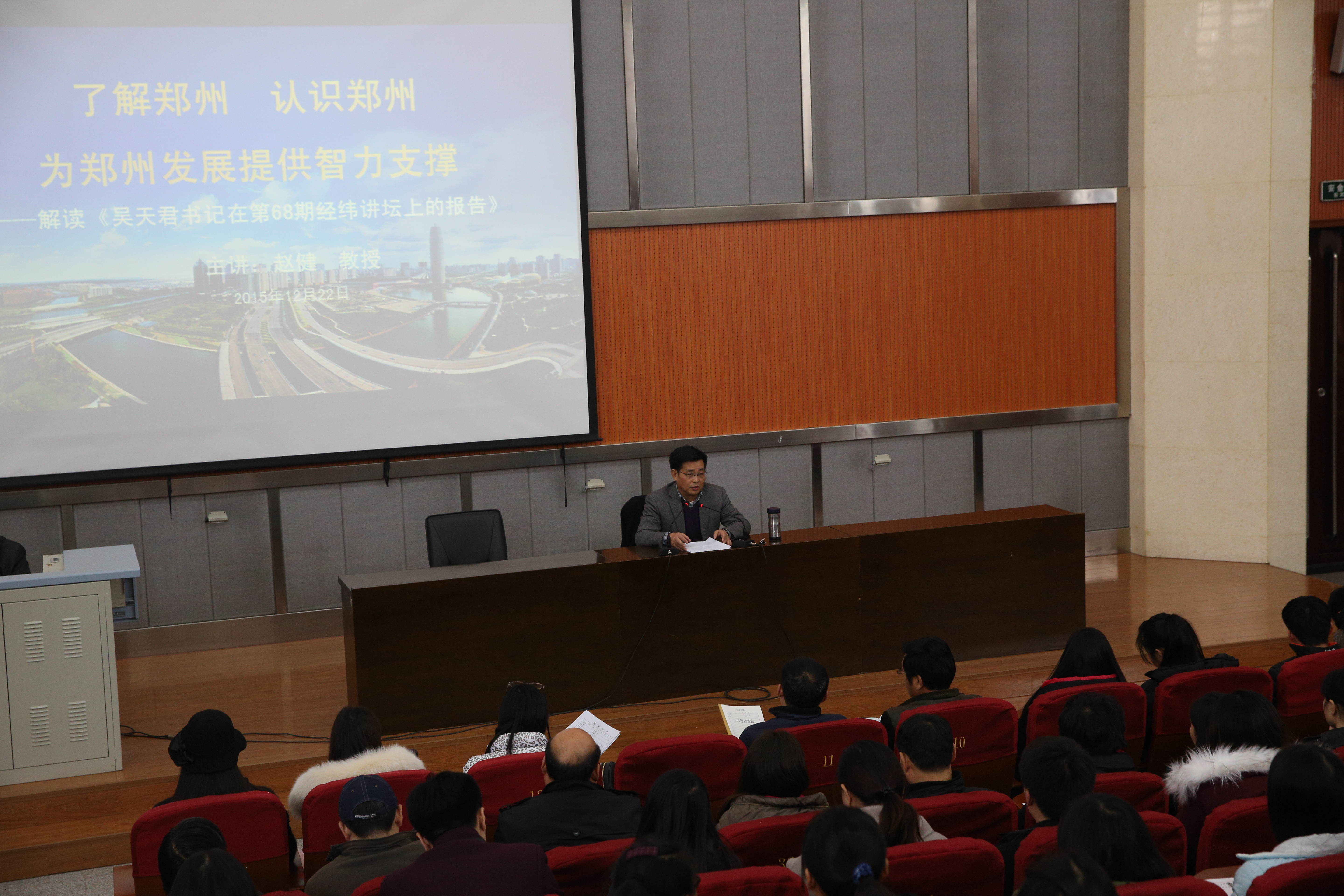 12月22日下午,校长赵健走进公共教学楼A301学术大讲堂,为经管学院师生做了《了解郑州、认识郑州,为郑州发展提供智力支撑》的解读报告,经管学院2015级新生和历史文化学院、传播学院、地理信息学院的老师一同聆听了讲座。