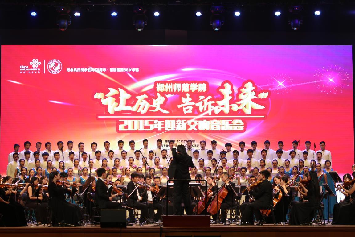 我校歌剧中心多尔克司交响乐团和郑州黄河交响乐团联袂为2015级新生带来了一场振奋人心的交响音乐会。在《红旗颂》的乐声中,晚会拉开了序幕。充满爱国主义情感的《我爱你中国》、动感活力的《卡门序曲》将广大师生带入到了生机勃勃、充满激情的音乐殿堂。其中《我的中国心》、《保卫黄河》这两首经典曲目的演奏,一度将晚会推向了高潮,获得现场阵阵的掌声。最后,迎新音乐会在一曲《怒吼吧黄河》中圆满落幕。在此次音乐会中,我校音乐与舞蹈学院的师生们也积极参与,担任部分曲目的独唱、合唱和指挥演奏。