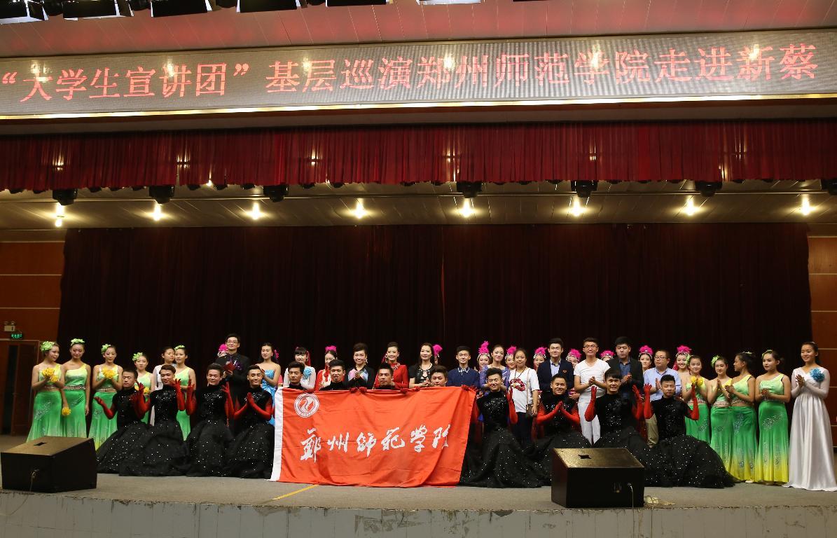 为践行社会主义核心价值观,落实中共河南省委宣传部、团省委、教育厅《关于开展“大学生宣讲团”基层巡演暨网上展播活动的通知》要求,8月31日晚上,我校“大学生宣讲团”基层巡演在新蔡县第一高级中学礼堂精彩上演。中共新蔡县委相关领导,我校党委宣传部、校团委等相关部门同志及新蔡县第一高级中学师生共计千余人观看了演出。