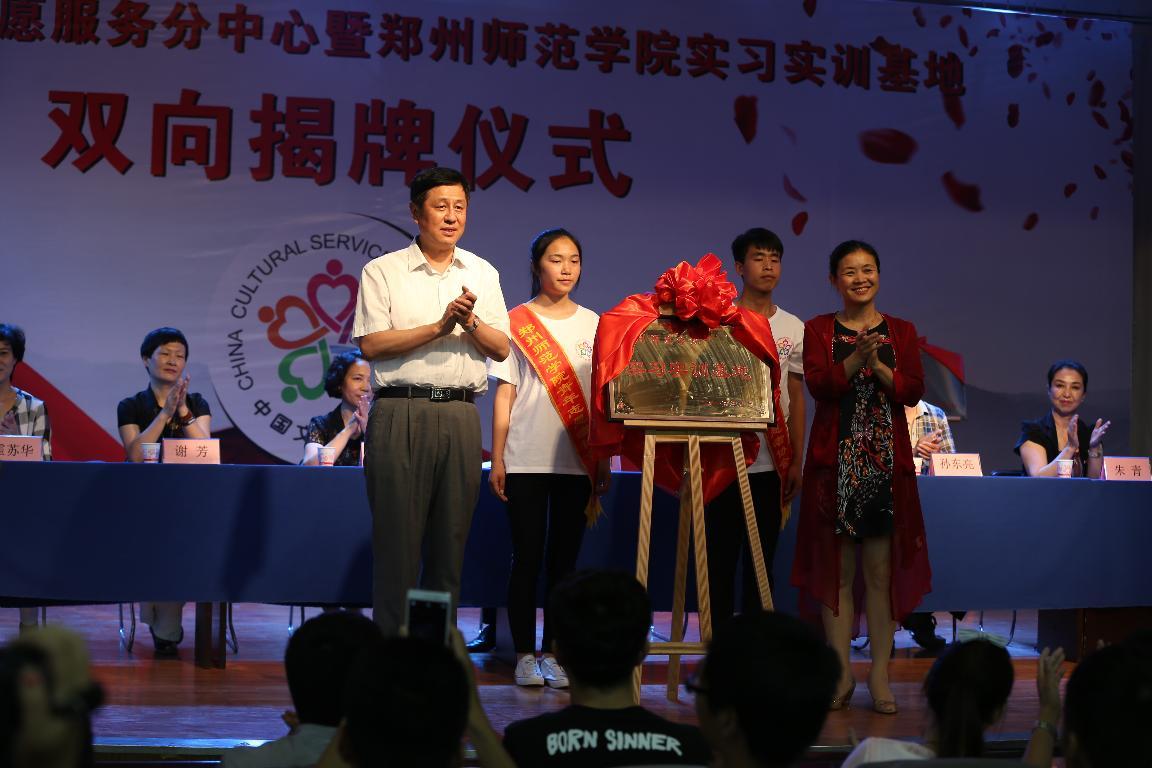 5月26日下午,郑州市文化志愿服务郑州师范学院分中心暨郑州师范学院实习实训基地揭牌活动在我校6号楼报告厅隆重举行,校党委副书记、工会主席弓民,郑州市委宣传部副部长宋建国,郑州市文明办副主任姬月莲等领导出席此次活动。