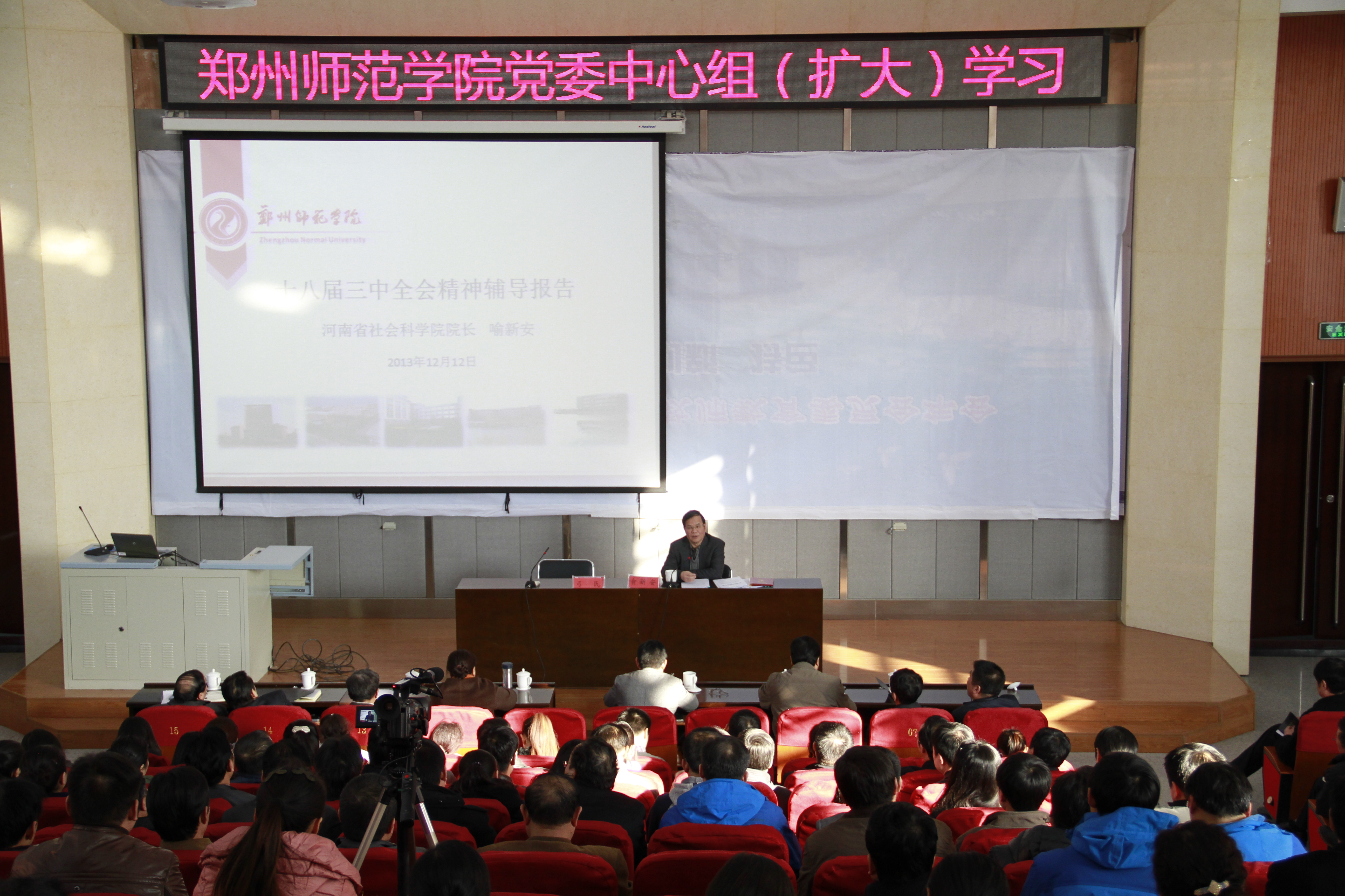 12月12日下午,校党委在东校区综合教学楼报告厅召开中心组扩大会议,学习党的十八届三中全会精神,特邀河南省社科院院长喻新安作了十八届三中全会精神辅导报告。全体校领导,学校副科级以上干部参加了报告会,大会由校党委副书记、工会主席弓民主持。